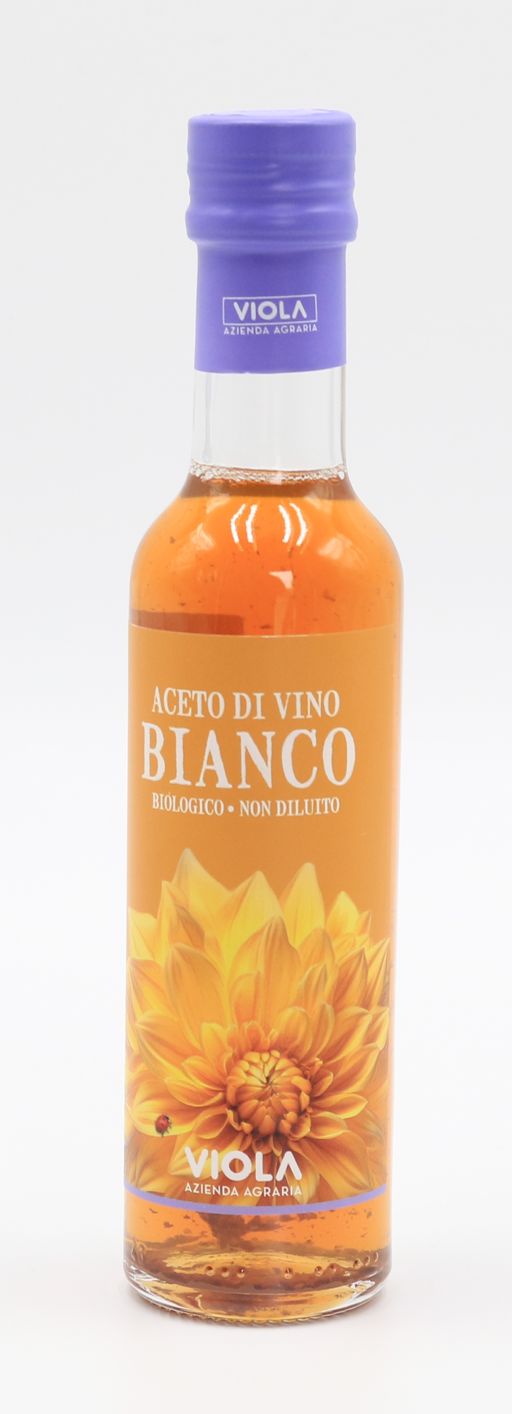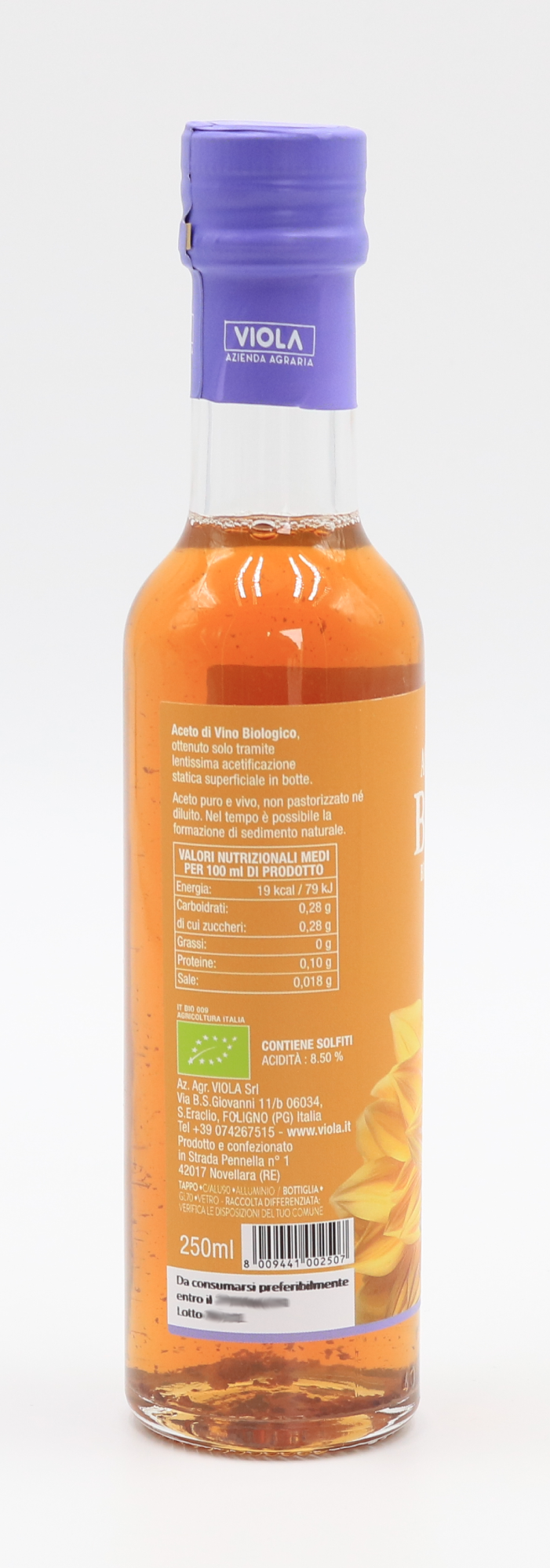 Aceto di vino biologico ottenuto solo tramite lentissima acetificazione statica superficiale in botte. Aceto di vino non pastorizzato ne diluito. Nel tempo è possibile la formazione di sedimento naturale.