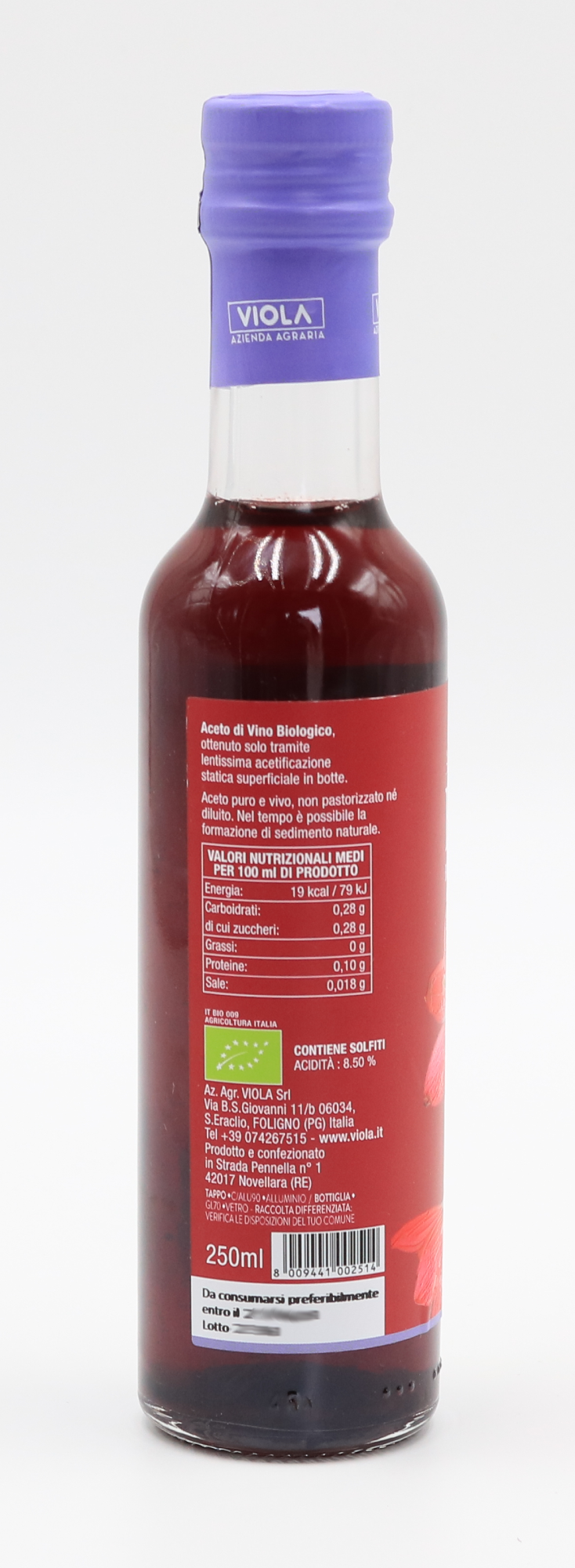 Aceto di vino biologico ottenuto solo tramite lentissima acetificazione statica superficiale in botte. Aceto di vino non pastorizzato ne diluito. Nel tempo è possibile la formazione di sedimento naturale.