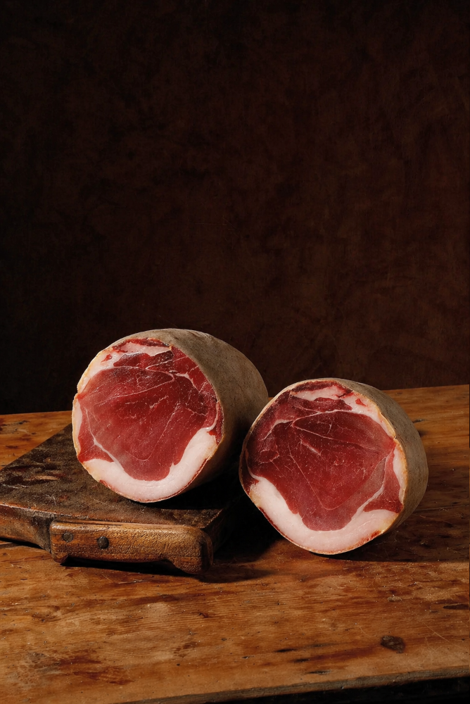 Si ottiene da cosce di suini pesanti, selezionate per l’equilibrata quantità di grasso che assicura morbidezza e sapore persistente.