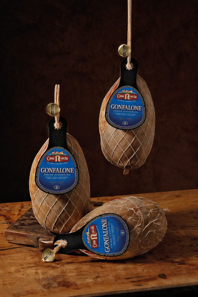 Il Fiocco di Prosciutto “Gonfalone” è una delle specialità più apprezzate di Casa Norcia, frutto della lunga esperienza della famiglia Perticoni nella lavorazione artigianale delle carni.