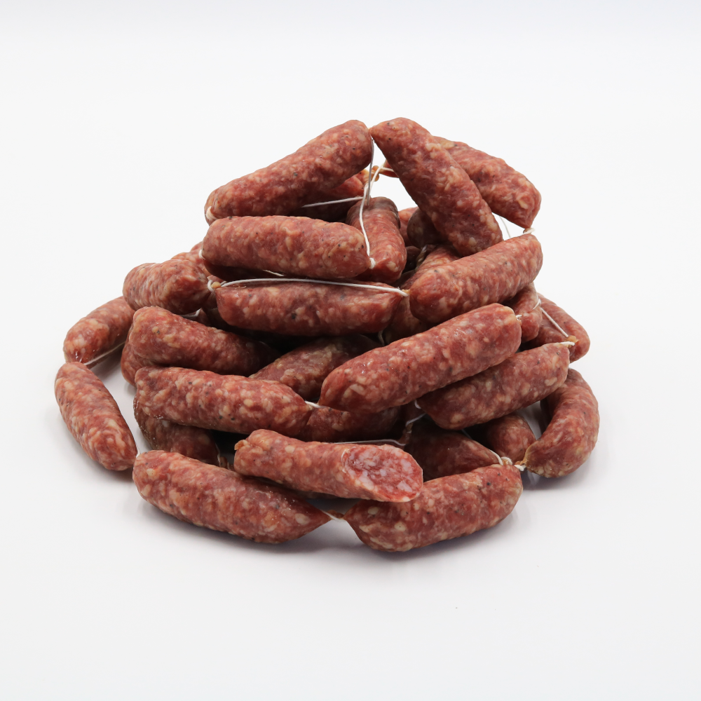 Salsicce di suino Casa Norcia: preparate con carni suine selezionate, dal gusto pieno e genuino. L’impasto, a grana medio-grossa, è condito con sale, pepe e aromi naturali che esaltano la qualità della materia prima. La breve stagionatura mantiene il prodotto morbido e fragrante, con una consistenza succosa e un sapore equilibrato.